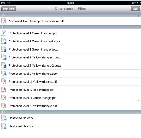 All the relevant access, sensitivity levels, usage control and usage overriding-with-reason options apply to the documents which are accessed through this app. Furthermore, the complete usage of this app, and the documents accessed therein, are reported back to the server. The app can be disabled in the event that the device is lost, thereby securing the documents that are present inside the device.
